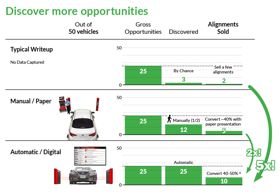 Check the most important alignment angles and edge-to-edge tire tread on every car that visits your shop, no stopping or labor required.